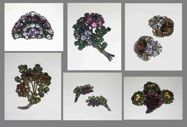 Top Left Amethyst, blue zircon and pearl dress clip, Middle Multi-gem floral spray brooch composed of two flower-heads to wire-work stems, with emerald leaves, Right multi-gem set brooches, each composed of a large circular-cut smokey quartz above a floral cluster of various gemstones. Bottom Left Multi-gem floral spray brooch, the triple clusters to wire-work stems and gem-set leaves, Middle Peridot and garnet earclip each designed as a leaf spray, Right Multi-gem set brooch designed as a trio of oval clusters above a garnet cluster stalk.
