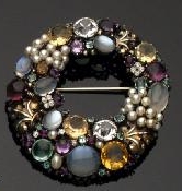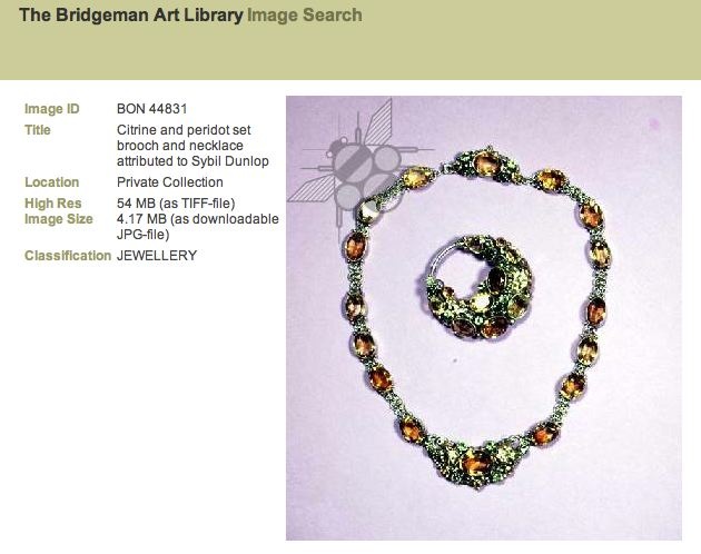 A Multi Gem Set Brooch, circa 1900, the circular brooch set with moonstones, citrines, seed pearls and diamonds with moulded silver leaves (Tennant Auctions 2003). The jewellery piece above was wrongly described as being ‘in the manner of Sybil Dunlop’ (Tennant Auctions Ltd 2003). Other auctioneers take the middle line and describe jewellery as either by Dorrie Nossiter or Sybil Dunlop, as above.“Arts and Crafts pin brooch attributed to Sibyl Dunlop or Dorrie Nossiter, the central elliptical moonstone cabochon enclosed by a network of leaves and tendrils set with water pearls and further moonstone cabochon above slender stem with stylised flowerhead terminal.” Lyon & Turnbull, 5th November 2003 (Live Auctioneers 2005).The problem is that there has been a cascade of misattribution leading to confusion as to which pieces were created by Dorrie Nossiter and which by Sybil Dunlop and many authors and auctioneers have followed each other blithely down this path rather than carrying out original research and really looking at the issues. A classic cascade is continued misatttribution by two authors Benjamin (2003) and Karlin (2004). Also a recent one I found where the attribution of an auctioneer has been accepted as accurate by the Bridgeman Art Library possibly accepting images and captions without any re-evaluation.