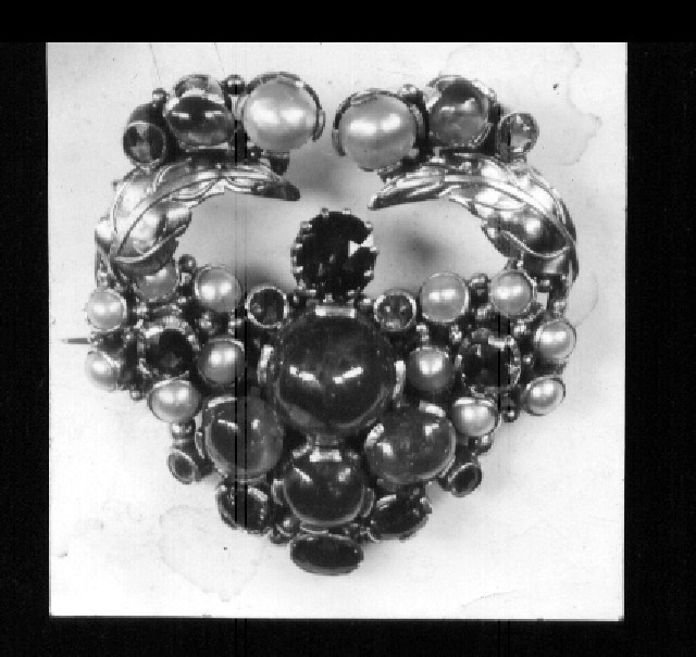 “Obviously the war years saw little advance in either design or technique, and ideas, such as they were, were drawn from the staider elements of thirties design. The jewels of Dorrie Nossiter had more in common with an earlier Arts and Crafts tradition than with any new emergent style. Her designs rely almost entirely upon the colours of the gems with which they are set for their effect, chromatic harmonies and contrasts rather than shapes and textures (Plate 96). The stones sit in light clawsettings-topazes, pearls, haematites, peridots and amethysts clustered in cheerful agglomerations-earrings that curl right around the ear with pearl drops trembling below, or fan-shaped clips for wearing on the cuff of a short sleeve.” (Hinks 1983 p110).