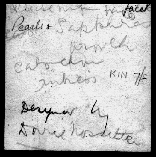 Following a designers development and ideas over a period of time without detailed records is not an easy task. This difficulty is exemplified with the number of previously incorrect dates on jewellery dealers websites, auction details and books about jewellery design. We do have several of Dorrie’s original designs as ideas and sketches on paper and the corresponding piece of jewellery or comments on the backs of photographs, as above. Unfortunately the family archive of material, see figure below is very limited and so my research has been limited into the family pieces that can definitely be identified as by Dorrie, oral history from Jeanne, Dorrie's niece and recorded information in published sources.