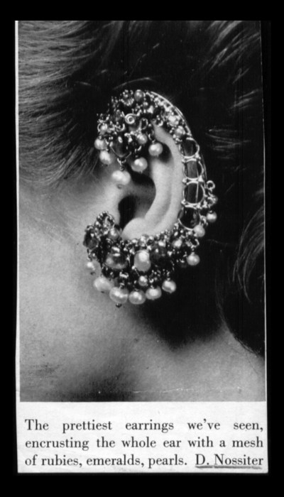 Newsclipping photograph of the finished piece. "The prettiest earrings we've seen, encrusting the whole ear with a mesh of rubies, emeralds, pearls. D.Nossiter"