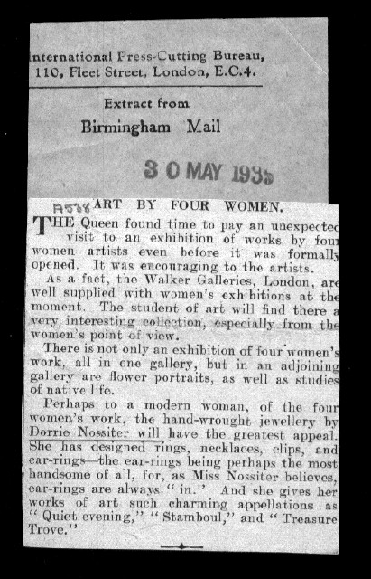 "She has designed rings, necklaces, clips, and earrings___the earrings being perhaps the most handsome of all, for , as Miss Nossiter believes earrings are always "in". And she gives her works of art such charming appellations as "Quiet evening," "Stamboul," and "Treasure Trove." Birmingham Mail May, 1935