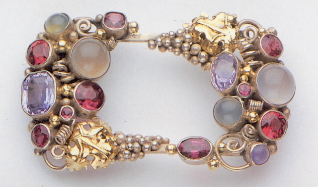 Page 125 "The long career of Scottish-born Sybil Dunlop began in the early 20th century and lasted until the late 1930s. Out of her studio-shop in Kensington Church Street in London came a plethora of handsome jewels, all hand-fashioned in the Arts and Crafts vein, but the later pieces tinged with Dunlop's unique brand of modernism. This brooch probably of the 1920s, features rich masses of silver, silver-gilt, stones and paste amid the leafy, beaded clusters and coiled tendrils common to early Arts and Crafts goldsmith's work."