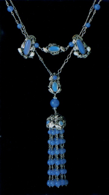 Page 133 "The Scottish-born Londoner Sybil Dunlop, many of whose hand-crafted jewels reflect her Arts and Crafts training, created most of her pieces in the Art Deco era. The long 1930s necklace, with tassel pendant and two matching clips, is indeed rife with Arts and Crafts materials and motifs - silver, chrysoprase, moonstone, leafy clusters, coiling wires - but its extreme length, moderne style and beaded tassel are very much of the Jazz Age.
