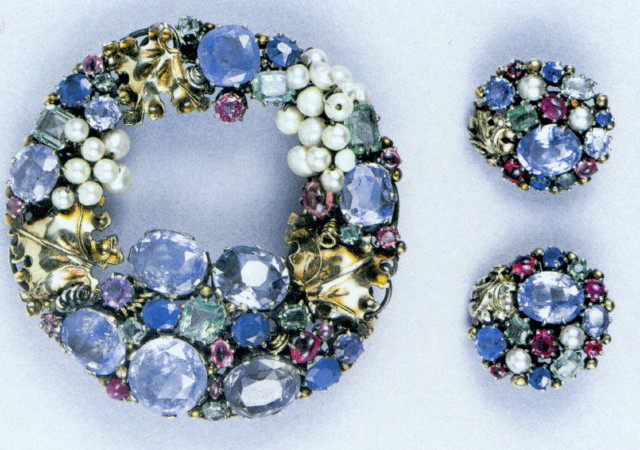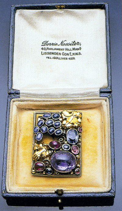 Finally, Sybil Dunlop (1889 - 1968), while not strictly speaking a competitor of Liberty, established a retail shop in Kensington High Street with a team of craftsmen specialising in bold silver jewels set with clusters of multi-colour gemstones and pearls which were further decorated with leaves and scrolls of gold.